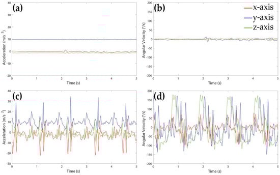 Example of signals acquired by accelerometer (left panels) and gyroscope (right panels) during 5 s of upright standing (panels (a,b)) and walking (panels (c,d)) of a healthy subject.