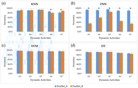 Mean accuracy (bar) and standard error (whisker) across the 61 subjects involved in the study for each dynamic activity (level walking (A3), ascending and descending stairs (A4 and A5), uphill and downhill walking (A6 and A7)), after post-processing. Four classifiers are analyzed: (a) K-Nearest Neighbors; (b) Feedforward Neural Networks; (c) Support Vector Machine; (d) Decision Tree. Asterisks (*) mark significant differences between accuracies reached by FeatSet_A and FeatSet_B (p-value < 0.05).