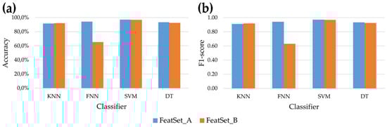 Analyzing the behavior of the four classifiers, it emerges that the SVM reached the best performances, allowing to correctly recognize more than 95% of windows for all dynamic activities and for both feature subsets. Comparing the two feature subsets, no significant differences were observed for every dynamic activity using SVM and DT, while FNN fed with FeatSet_B was not able to reach acceptable results. This behavior is also evident in Figure 4, where the mean accuracy and F1-score across all seven activities (both static and dynamic) examined in this study is showed for each classifier. Overall, the highest accuracy achieved by the SVM is 97.1% and 96.7% for FeatSet_A and FeatSet_B respectively, while the worst mean accuracy was 65.5% obtained using FNN fed with FeatSet_B. The same behavior can be observed for the F1-score (Figure 4 panel b): the SVM had a score equal to 0.971 and 0.967 for the two sets, meaning that very high values of recall and precision were reached in both cases.