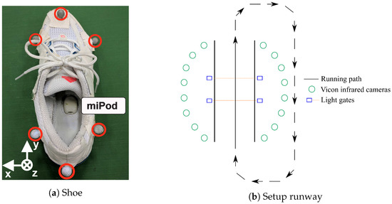 (a) Shoe equipped with a miPod sensor and the marker setup. The IMU is located within the sole of the running shoe. The marker setup allowed for a computation of velocity and stride length. (b) Illustration of reference system setup. The subjects ran through the capture volume of the motion tracking system, created by 16 infrared cameras, and looped back around.