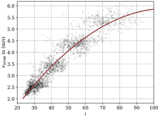 In biomechanics, the relationships between stride frequency, stride length, running velocity, and body height was investigated [5]. The results indicated that with increasing running velocity, stride frequency and stride length increase. Thus, increasing running velocity is an interaction of increasing stride length and stride frequency [5]. Stride length itself depends on body height and can be expressed as a relative stride length. From these relationships, a generic model relating running velocity and stride length on the basis of the stride frequency can be deduced. The general idea behind this approach is the inverse correlation between velocity and stride time (the higher the velocity, the shorter the stride time). Thus, in order to estimate the stride length, only the stride time has to be distinguished by segmenting the data into single strides. An average velocity of the stride can then be calculated using the stride length and the measured stride duration.