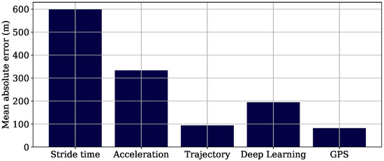 Figure 9 shows the MAE of the total running distance for the field study dataset, both for the algorithms and GPS-based estimation. The figure indicates that the Trajectory algorithm performed best with a MAE of 94.0 m. The error was comparable to that of the GPS-based estimate (82.1 m).
