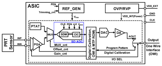 The limitation in the number of the pins and the clock frequency of the system is the reason to convert the calibrated digital code to analog signal again. In this circuit, Proportional to Absolute Temperature (PTAT) is used to provide the temperature information which is converted to digital using ADC. The PTAT circuit output is a voltage range where the minimum voltage value is proportional to the minimum temperature and the maximum voltage value is proportional to the maximum temperature. The operating temperature range of this system is −40 °C to 150 °C. In addition, OVP/RVP is the Over Voltage Protection/Reverse Voltage Protection circuit which protects the over voltages and the reverse voltages to the Application-Specific Integrated Circuit (ASIC). The Reference Generator (REF_GEN) block provides the bias voltages (Vbias) to the ADC. These bias voltages include VREFT, VREFB, and VCM. Their values are 1.5 V, 0.9 V, and 1.2 V, respectively. Due to the pin limitations of the system, the One Wire Interface (OWI) Communication protocol has been applied in this system to control the registers of the digital part.