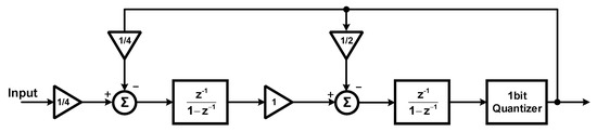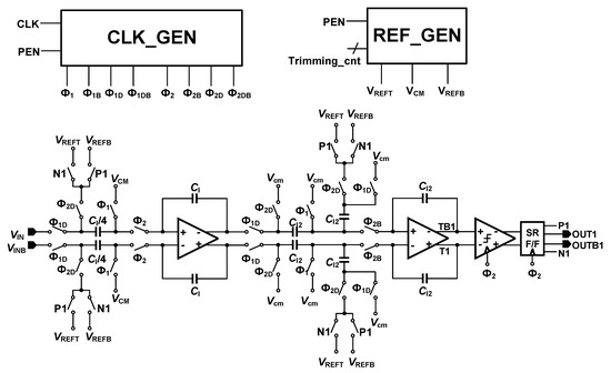 Figure 2 presents the block diagram of the SDM. This is a second order discrete-time SDM with Cascaded Integrator Feed-Back (CIFB) structure. The required resolution of the system is just 12 bits; to keep the area of the SD-ADC below 0.5 mm2, only second-order SDM is used. Generally, the low order SDMs show better stability performance. The system applies 2.5 MHz clock frequency. The required bandwidth of the system is at kilohertz level. Therefore, the Over-Sampling Ratio (OSR) is selected to be 1024 and 2048. This is a reconfigurable structure and the OSR values can be applied based on the input frequency bandwidth, the clock frequency, and the decimation factor of the CIC filter. The reason the SD-ADC needs to be configurable is that the pressure and the temperature signals have different frequencies, but they share the same ADC. Therefore, the system has been designed to have a configurable structure and able to control the input signal bandwidth and data rate. The modulator loop is the cascade of two switched capacitor integrators, where the output is fed back to the integrators with the coefficients of 0.25 and 0.5. These coefficients are the ratio of the sampling and feedback capacitors. These values have been derived from MATLAB/Simulink modeling and justified with the Cadence Spectre simulations. This structure uses a comparator as a 1-bit quantizer. The circuit implementation of the SDM is presented in Figure 3. The differential input signals are sampled in the sampling capacitors, as shown in Figure 3. The ratio of the sampling capacitor (CI/4) and the capacitor around the amplifier (CI) decides the feedback coefficient values of the first integrator. The switch sizes are 10 µm/0.18 µm and the CI value in Figure 3 is 20 pF. The gain bandwidth of the amplifiers is designed to be over 5 times of the sampling frequency. By proper sequencing of the switches and applying non-overlap control signals, channel charge-injection effects can be neglected. Besides, to design the parasitic insensitive integrators, adopting proper clock timing to the sampling capacitors is essential [12].