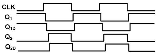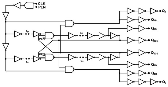 The structure of the clock generator (CLK_GEN) is shown in Figure 4. The Q1, Q1D, Q2, and Q2D clock signals are generated through this circuit. However, as the switches in Figure 3 are TGATEs—which apply both PMOS and NMOS transistor switches, Q1B, Q1DB, Q2B, and Q2DB—clock signals that are the inverted signals of the Q1, Q1D, Q2, and Q2D are also generated on clock generator circuit. It is notable that Q1D and Q2D are delayed form of Q1 and Q2 signals. Figure 5 shows the clock signals generated on the clock generator block. The Q1B, Q1DB, Q2B, and Q2DB signals are not shown on this figure as they are just the inverted form of Q1, Q1D, Q2, and Q2D signals. As it can be observed, Q1 and Q2 signals are non-overlapped clocks, as well as Q1D and Q2D signals. It is notable that to be visible, the delays in Figure 5 are exaggerated. This block was designed for worse cases and with some margins to avoid the delays differences due to process variations. The PEN signal is controlled by the OWI which is included in the Digital block in Figure 1. The clock signal (CLK) is applied to this circuit externally.
