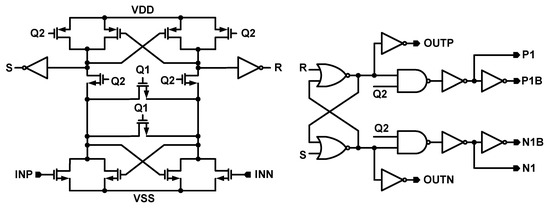 The structure of the comparator is presented in Figure 6. The dynamic type comparator is used in this structure, as it has lower power consumption comparing to the static ones [13,14]. The differential outputs of the second integrator are connected to the INP and INN inputs of the comparator. The outputs of the comparator (OUTP and OUTN) are decided through latches. Q1 and Q2 clock signals control the comparator clocking and the P1 and N1 signals (Figure 6) are decided and used to control some of the switches in the SDM as it is shown in Figure 3.
