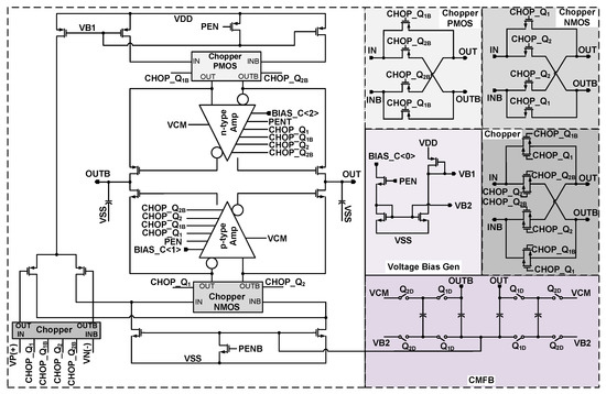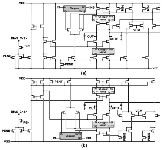 Figure 7 shows the structure of the amplifier which is applied to the integrator. The amplifier has gain-boosted p-type Folded-Cascode structure. This structure is slightly different than the gain-boosted amplifier presented in [15]. The chopping has been applied to the inputs of the gain boosting amplifiers as well. The DC gain of this amplifier is over 100 dB. The gain boosting amplifiers adopt n-type and p-type Folded-Cascode structures as they are shown in Figure 8a,b. The choppers are used in these amplifiers to reduce the effect of flicker noise in the lower frequencies. The choppers clock frequencies are decided in the way that the flicker noise is pushed to the frequencies that are out of the band of interest. According to where these choppers are applied, they adopt p-type (Chopper PMOS), n-type (Chopper NMOS), or p- and n-type (Chopper) MOS transistors as their switches. The structures of these choppers are shown in Figure 7. To reduce the flicker noise in low frequencies, the choppers are applied to the gain-boosting amplifiers as well, as shown in Figure 8. All the designed amplifiers apply the common mode feedback (CMFB) in their circuitry to keep the output bias voltage levels. The applied choppers in Figure 8 are like that of Figure 7 and are not repeated in Figure 8. Furthermore, their clock signals are also not shown in this figure. As it is shown, the choppers apply clocks in their circuitry. These clock signals are shown as CHOP_Q1, CHOP_Q1B, etc., in Figure 7. The clock generator to produce these clocks is similar to Figure 4. Nevertheless, the frequency of these clocks is lower than the sampling clock. In addition, it is notable that to make the design and layout easier, the amplifiers in the first and second integrators are designed to be the same. Nevertheless, the chopping in each of the amplifiers can be enabled or disabled.