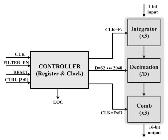 The target resolution of the designed SD-ADC is over 12-bit. The SDM has second order configuration, as mentioned before. In order to achieve the desired resolution, a sinc3 filter is adopted for this design. The decimation filter is a CIC filter [17], with a configurable option for different data rates, as shown in Figure 9. It is composed of three integrators and three comb filters in cascaded form with a controller. The cascaded integrator and the comb filter implements the transfer function (Equation (1)) and (Equation (2)) [18]. It means that the decimation factor can be changed to adjust ADC output for different input bandwidth. Therefore, resultant ADC can be used for a variety of applications by easily changing the data rate at the filter stage.