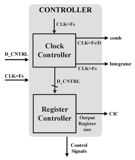 The controller used in this architecture is comprised of a clock controller and a register controller, as shown in Figure 10. The clock controller applies the necessary clocks required for all blocks. Furthermore, it generates some control signals required for the measurement setup. Register size can be calculated from Equation (3) and largest possible size (for D = 2048) yields to be 35 bits for an ideal noise shaping case. This will be the main register used by all filters. The controller will select MSB 14-bits from this register depending upon the decimation factor and the remaining bits will be discarded.