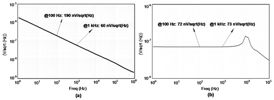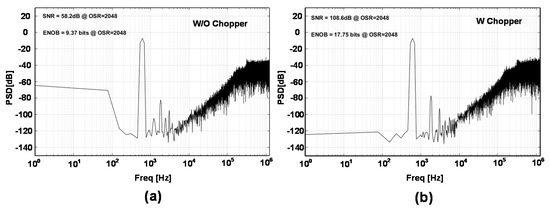 Noise performance of the SDM in post-simulation (a) without chopper and (b) with chopper.