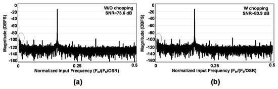 Measurement results of the FFT spectrum for 0.4 kHz sine wave sampled at 2.5 MS/s with OSR of 1024, 214 number of samples and Hanning window (a) without chopping and (b) with chopping.