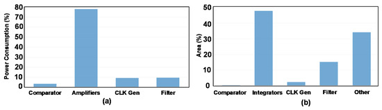 The total power consumption of the SD-ADC is about 646 µW from a 2.4 V supply voltage. The power break-down is shown in Figure 16a. As it can be seen, around 78% of the power is consumed in amplifiers while this portion for the filter, CLK_GEN, and comparator are 10%, 9%, and 3%, respectively. The area break-down is also presented in Figure 16b. Integrators with 48%, consume the largest area of this structure. The filter occupies only 15% of the area. In this figure, “Other” relates to current and voltage generator, the digital part of the chip to control the trimmings and testability, and dummies.