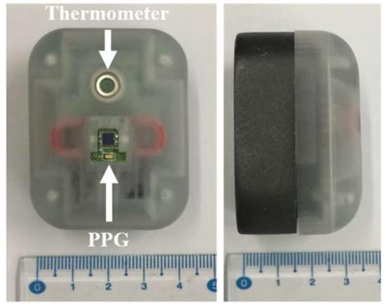 This development in the PPG signal processing have broadened application of the PPG sensor in healthcare monitoring system. Furthermore, with the sensor’s portability and relatively small in size, the sensor can also be used and implemented into a small embedded device, such as a wearable health device. This wearable device is commonly equipped with multiple sensor modules to monitor physical condition of its user, such as body temperature, heartbeat, respiration rate, and motion. The device also needs a special patch or strap to be placed on the user body or skin. As an example, the wearable health device developed by Byteflies, Sensor Dot, can measure multiple vital signals, e.g., photoplethysmogram (PPG), electrocardiogram (ECG), respiration, motion, electrodermal activity (EDA), and electromyogram (EMG) [24]. The device utilizes multiple sensor signals with a multimodal signal analysis so that it can provide a whole new level information for medical assessment. These powerful features are very useful for general health-care monitoring system, especially that for complex analysis of physical state determination.