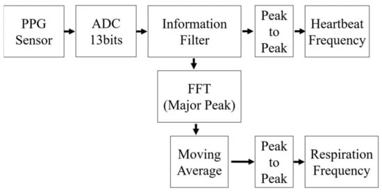 Once filtered, the frequencies of the PPG signal were evaluated by using an FFT analysis. In the embedded device, the FFT analysis was conducted on a major peak only and was directly measured in frequency domain. Since the FFT output can actually describe distortion in the input signal, changes of intensity in the heartbeat signal due to intrathoracic pressure can also be measured by monitoring the major peak’s variation. Then with a moving average filter and peak-to-peak detection, the respiration rate can be calculated based on these variations that show the changes in the filtered heartbeat signal [15,16,22,28].