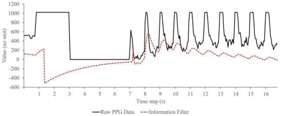 Figure 4 illustrates a typical output signal of the information filter. In this figure, raw data from the ADC system are displayed as a solid line and the filter output is distributed in a dotted line at each time step of approximately 50 ms. As shown in the figure, the PPG sensor took approximately seven seconds before it started measuring the heartbeat signal. During this time, the ADC output was raised to a maximum value and then significantly dropped non-linearly to zero (significant increase-and-decrease). On the other hand, the information filter output follow the ADC data linearly on every time step with delay of about 150 ms. Based on the figure, initial heartbeat detection will be calculated after a delay of about 1.5 s from the first detected heartbeat signal of the PPG sensor. This means that the algorithm has about a 1.5 s delay or initial detection time for heartbeat measurement.