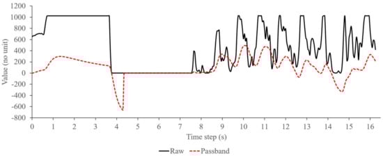 Compared with the passband filter that passes signal data within a range of the filter’s cutoff frequencies, the information filter has different criteria to validate the signal, i.e., based on the probability of mean and covariance of the filter’s estimation state and observation model. On the embedded device, the passband filter approaches the PPG signal that pass through the cutoff frequencies of a serialized low and high pass filter, as shown in Figure 5. Here, from 4 s to 7 s, the passband filter output (shown in dotted-line) immediately follows the raw signal data (in straight-line) from PPG sensor as the signal passes the filter’s cutoff frequencies. On the other hand, during the same time in Figure 4, the information filter slowly approaches the raw signal data because of the previous significant increase-and-decrease that lowers the probability of signal validity. Then after 7s, as the filter assures about the validity of the signal, it starts to follow the PPG signal similar with the passband filter. Therefore, when a fluctuation or distortion occurs on the PPG signal during the measurement time, the information filter will not immediately follow the signal before assuring its data validity. On the other hand, the passband filter will pass the signal as long as the signal is within its cutoff frequencies range, regardless uncertainties in the signal data. Based on this, the information filter on the embedded device can actually perform better than the passband filter for removing noises of the PPG signal, especially when the signal contains uncertainties or distortion that is usually caused by fluctuation of sampling time.