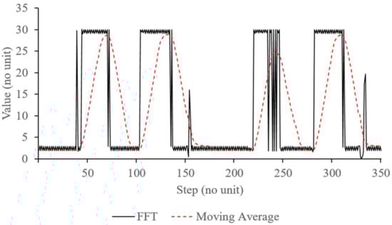 Unlike [31] that used pattern recognition to extract PPG waveform, an FFT analysis was implemented to monitor variation of the PPG signal. Due to limited resources of the embedded device, FFT analysis was simplified and conducted in time domain, similar with [30]. Adding moving average to the FFT can extract useful filtered signal data that correspond to the occurrences of RIIV as shown in Figure 6. With this, respiration rate can be derived relatively accurately based on the peak-to-peak analysis of the output of the moving average calculation.