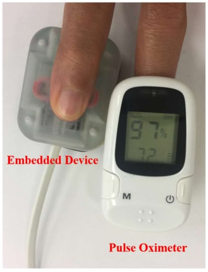 For the heartbeat frequency calculation, a pulse oximeter was used to measure the heartbeat frequency of the test subject, as shown in Figure 7. The measurement outputs from the oximeter and embedded device were logged simultaneously during the test.