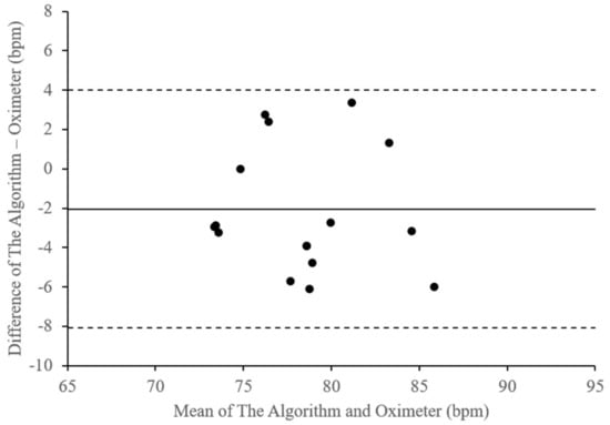 Figure 10 illustrates these differences in the heartbeat rate measurement results of the embedded device compared with those of the pulse oximeter output. Table 4 lists the plot parameters of the heartbeat rate differences. The figure and table describe a bias of –2.03 bpm, with a lower limit of agreement of –8.06 bpm and an upper limits of agreement of 4 bpm. With that, the average of the difference is approximately 4.31% with a standard deviation of about 3.17.