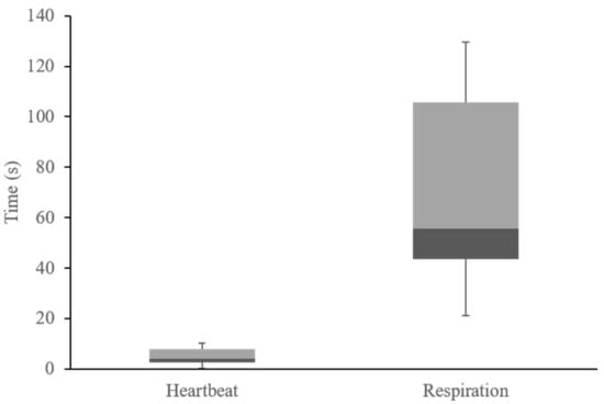 Figure 12 shows the average distribution of the heartbeat and respiration measurement initial times of the embedded algorithm. In this figure, the initial heartbeat detection time is averaged in about 4 s. The fastest time is approximately 0.33 s from the first heartbeat signal that was detected by the PPG sensor. On the contrary, the initial respiration detection time is about 53 s owing to the FFT buffering and sampling time. With that, respiration rate output values of the algorithm in the embedded device are converged in less than 90 s. As shown in Table 7, the fastest detection time is about 21 s.