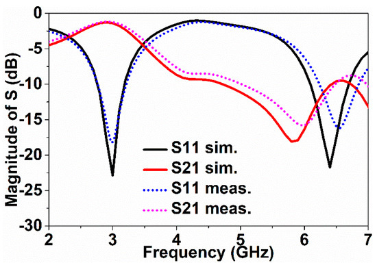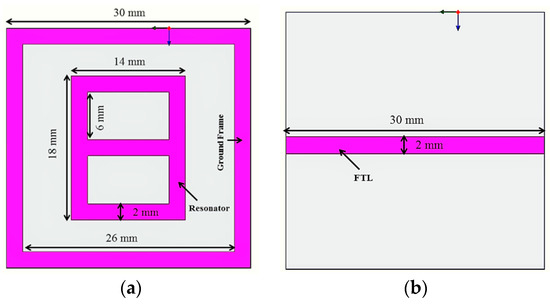 The metamaterial consists of a digit 8-shaped resonator, surrounded by a ground frame, along with a feeding transmission line (FTL) exhibiting metamaterial characteristics. The metamaterial was prototyped on the FR4 material, which has 4.6 relative permittivity and 0.02 loss tangent. The resonator and the ground frame were sketched on the same portion of the substrate. The feeding transmission line (FTL) was sketched on the opposite portion of the substrate. The excitation is supplied to the resonator through the FTL. The measurement of the sensor can be performed using common laboratory facilities in lieu of using the waveguide, as the resonator, ground frame, and feedline are all on the same microstrip. To achieve metamaterial properties, more than one unit cell is usually utilized, whereas, in this work, a single cell was used to achieve the metamaterial characteristics. The design of the resonator is simpler compared to the previously reported planar resonator-based sensors. Again, the previously reported similar works used larger resonator sensors to detect the over-layers. Moreover, some sensors have limited sensitivity as compared to the proposed sensor. The metamaterial was designed and investigated using the High-Frequency Structural Simulator (HFSS) software. The geometry of the sensor is shown in Figure 1. Figure 2 depicts the prototype of the digit 8-shaped resonator-inspired metamaterial sensor. The N5227A PNA Microwave Network Analyzer (Agilent Technologies, Santa Clara, CA, USA) (10 MHz–67 GHz) has been used to measure the sensor. The reflection and transmission coefficients of the sensor are depicted in Figure 3, where resonances were found at 3 GHz and 6.5 GHz. The transmission resonant frequency was observed at 6.0 GHz.