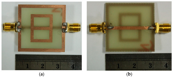 In the measurement, the FR4 substrate, with 1.66 mm thickness with 4.6 relative permittivity, and the Rogers RO4350 substrate, with 1.53 mm thickness with 3.66 relative permittivity, were utilized as the over-layers. Figure 8 depicts the sensor with over-layers along with the PNA measurement set-up. Figure 9 depicts the simulated and experimental resonance responses of the metamaterial sensor when detecting the unknown material.