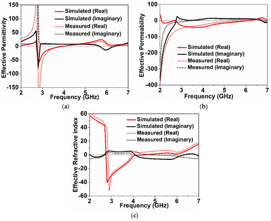 At the peak of the transmission (S21), the effective permittivity and permeability became negative. In Figure 4a, the effective permittivity remains negative from 2.7 GHz to 4.1 GHz, whereas Figure 4b depicts a negative permeability from 2 GHz to 6 GHz. The refractive index became negative as the permittivity and permeability remained negative, as shown in Figure 4c. Therefore, the metamaterial depicted double-negative properties in the bandwidth from 2.7 GHz to 4.1 GHz, and all parameters had a negative peak at 3 GHz [1,24].