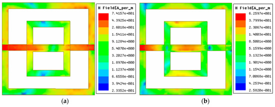 Magnetic field distribution of the sensor: (a) at 3.0 GHz, and (b) at 6.5 GHz.