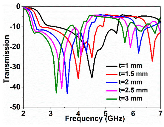 The frequency responses for changes in over-layer thickness were observed. In the simulation, an over-layer having 4.4 dielectric constants was used, as it has parameter values close to the FR4 substrate. The simulated frequency responses with the changes in over-layer thickness are shown in Figure 7. The resonance shifted downward when over-layer thickness increased. The metamaterial sensor with the over-layer constitutes a resistor/inductor/capacitor (RLC) circuit, where the resonance is determined by effective capacitance and inductance. As effective inductance and capacitance vary when the over-layer thickness increases due to the self-resonance, the resonance shifts downward because of the resonance frequency changes with the effective capacitance and inductance. As the ground plane around the resonator provides additional capacitance and inductance, it has significant effects on the resonance frequency.