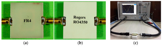 Sensors with over-layers: (a) FR4 over-layer, and (b) Rogers RO4350 over-layer. (c) PNA measurement set-up.