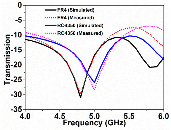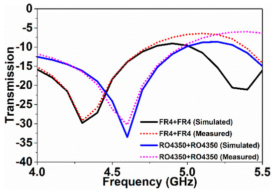 The frequency shifts depend on the over-layer thickness and the over-layer’s permittivity. The larger the values of thickness and permittivity are, the more the resonance shifts downward. The higher the over-layer thickness and permittivity become, the larger the downshift of the resonance becomes. In this article, the sensitivity of the sensor was measured considering the change in over-layer thickness upon keeping permittivity constant. In Figure 9, the resonance moved downward when the over-layer thickness increased. The over-layer thickness was increased by adding etched substrates, making a stack of substrates. There existed negligible gaps between the stack of substrates. However, the measured results differed in some cases due to the little gaps between the stacked substrates. The thickness of FR4 is larger than that of the Rogers RO4350 substrate; thus, for the FR4 over-layer, the resonance decreases further than the Rogers RO4350 over-layer. For specific clarification, the transmission resonance was at 6.0 GHz with no over-layer; however, using the Rogers RO4350 and FR4 over-layers, the resonances moved to 5.0 GHz and 4.8 GHz, respectively. As the thickness increased, the resonance frequency shifted downward. The greater the thickness of the over-layer became, the more the resonance shifts occurred. Using the shifting values of the resonance frequency, the sensitivity of the sensor was calculated. Considering the frequency shift as a function of over-layer thickness, the sensitivity of the metamaterial sensor was 625 MHz/mm for a single over-layer. For a double over-layer, FR4 + FR4 and Rogers RO4350 + Rogers RO4350 substrates were utilized. Figure 10 depicts the resonance responses for the double over-layers.