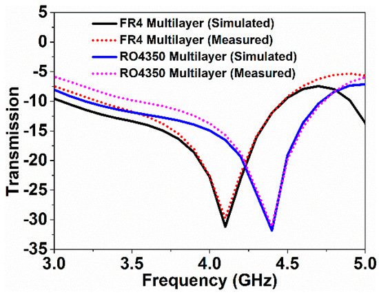 For a further extension of the experiment, multiple over-layers were considered. In this case, FR4 + FR4 + FR4 and Rogers RO4350 + Rogers RO4350 + Rogers RO4350 substrates were utilized. The simulated and experimented results are plotted in Figure 11. The resonance downshifted when the thickness increased. Using the Rogers RO4350 + Rogers RO4350 + Rogers RO4350 and FR4 + FR4 + FR4 multiple over-layers, the resonances downshifted to 4.4 GHz and 4.1 GHz, respectively. Considering the frequency shift as a function of over-layer thickness, the sensitivity of the metamaterial sensor was 354 MHz/mm for the multiple over-layers experimented above.