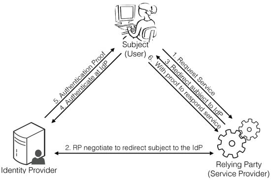 Digital identity management systems are responsible for managing users’ identity information, consisting of identifiers (UserID, email, URL, etc.), credentials (certificates, tokens, biometrics, etc.) and attributes (roles, positions, privileges, etc.) [4]. Figure 1 depicts a sample instance of traditional IdM systems, which comprises three main stakeholders: subject (also known as user), relying party (also called service provider) and identity provider (IdP) [18]. The three different parties are interdependent entities: the subject requests access to services from the relying party, which requires the identity provider to challenge the subject identity through the authentication protocol.