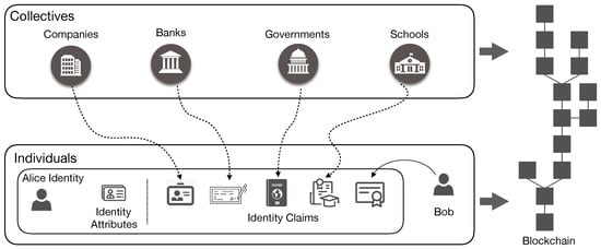 As shown in Figure 2, there are two individuals (Alice and Bob) and several collective examples (i.e., companies, banks, governments, and schools). The individual or collective identity, composed of the identity attributes and identity claims, could be gradually completed through the following steps:
