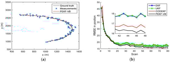 where , and . We let . Figure 5b shows the estimated target trajectories obtained by the EKF, UKF, CODEKF and PEKF-VB for a single run.