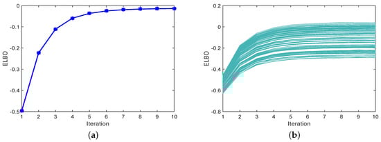 To illustrate the convergence of PEKF-VB, we present the ELBO for different numbers of iterations in Figure 4. Figure 4a illustrates the ELBO at the second scan, and Figure 4b shows the ELBO for all scans. Clearly, the ELBO increases with the number of iterations increases, showing that the iteration procedure in PEKF-VB converges.