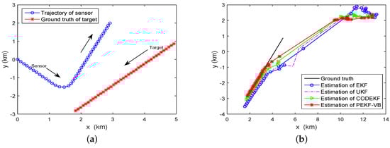 Bearing-only tracking. (a) Tracking scenario (b) Estimation obtained by EKF, UKF, CODEKF and PEKF-VB.
