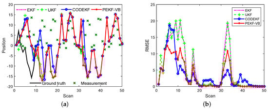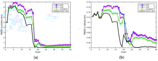 Based on 1000 Monte Carlo simulations, the RMSE comparison of EKF, UKF, CODEKF and PEKF-VB is illustrated in Figure 6, where the number of iterations for PEKF-VB is 5.