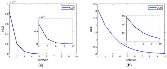 Value of metrics versus the number of iterations for PEKF-VB and CODEKF. (a) KL divergence in PEKF-VB, (b) COD in CODEKF.