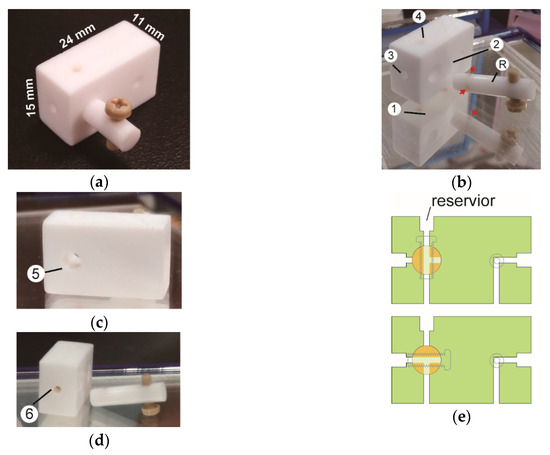 The port (DK1 port) is made of a block of Teflon (polytetra-fluoroethylene, PTFE) (Figure 1a). The bottom side of the port contains two openings for the input and output of fluid flows (Figure 1b). The left bottom opening leads to a mini three-way switch which is made by drilling a hollow cylinder onto the front wall of the port and fitting the cylinder with a rod having T-shaped channels (Figure 1b).