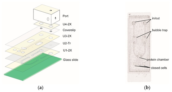 Microfluidic protein chip. (a) Scheme of laying units of double adhesive films (2X), transparency film (Tr), coverslip, and port on the glass slide. (b) An assembled chip (top view).