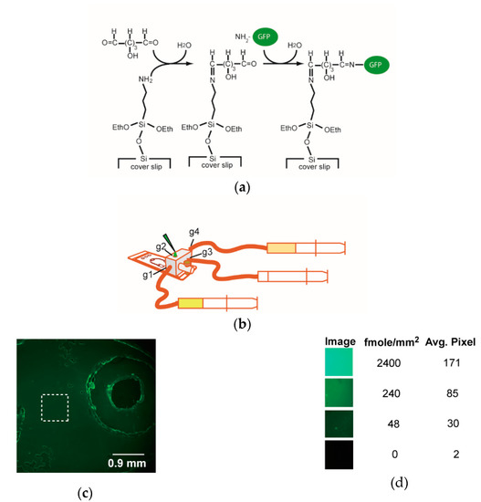 The immobilization of proteins in the surface of microfluidic chips is a frequently performed task in the applications of Lab-on-Chip technology (e.g., [31,32,33,34]).