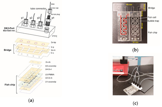 This system contains a port, chip, and bridge. First, we made a new port. Although the DK1 port worked fine for the protein chip described above, it had two limits. Occasionally, tubes fell off from the port in a prolonged usage (>12 h). Also, we found that the plug-and-go tube connection did not support the tubes with diameter larger 3 mm due to the shallowness of the plug. Accordingly, we designed the DK2 port, which also had four gates. The DK2 port (Figure 5a) was made of four tubing connectors and a block of PTFE. Second, the fish chip consisted of units of coverslips, double adhesive films, and PMMA plate (Figure 5a). The PMMA plate had large holes as fish cells and small holes as bubble traps. Third, we made a bridge with tunnels to channel fluid flows between the port and the chip (Figure 5a,b). Double adhesive films were used to bind the bridge to the port and the chip. With a bridge, the port does not have to be directly fixed over the chip. Also, two fish chips could be assembled together to form a small array (Figure 5b). A DK2 port channeled fluid flows from one chip to next one (Figure 5c).