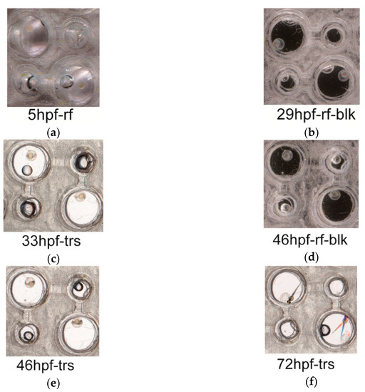 The fish chips were used to study the developments of individual embryos of zebrafish (Figure 6). The embryos of 5 hpf (hours post fertilization) were placed in the cells, and the developments of embryos were periodically photographed with a home scanner (Figure 6). The larva fishes could be retrieved from the chips at the end of observation (see materials and methods). The chips were scanned with three methods, reflection without a top cover (Figure 6a), reflection with a black cover (Figure 6b,d), and transmission (Figure 6c,e,f). Apparently, the presented system of chip array supported the developments of fish embryos. Also, an image scanned with transmitting light was best in revealing the main characteristics of embryos and baby fishes. Due to the color of the background, the features of embryos were not distinct in images scanned by the reflected light without top cover (Figure 6a).