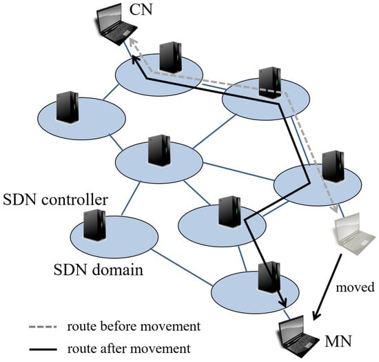 - Hata, M.; Soylu, M.; Izumi, S.; Abe, T.; Suganuma, T. SDN Based End-to-end Inter-domain Routing Mechanism for Mobility Management and Its Implementation. IEICE Tech. Rep. 2017, 117, 71–76. [Google Scholar]
