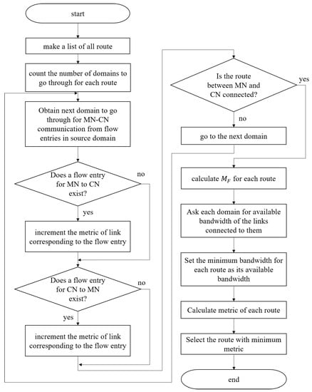 Equation (2) defines the calculation of the metric for the number of domain hops, Equation (3) defines the calculation of the metric for the flow operations, and Equation (4) defines the calculation of the metric for the available bandwidth of each route. means the number of domains route k goes through, means the number of flow operations for switching route k, and shows the minimum bandwidth of route k. means the number of domains in the network and means the largest bandwidth in the network. shows when we set the number of domains in a network as N. This is because we need to set flow entries for both ways for communication between an MN and a CN. , , and are weights to take balance among each parameter.