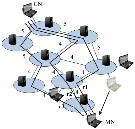 An example of the routing process is explained according to the flowchart. Figure 4 indicates an example of network. The numbers near links are their bandwidth. When an MN, which is communicating with a CN, moves to another domain, the controller of the destination domain detects the movement. Then, the controller creates a list of all possible routes from the MN to the CN. Figure 5 shows the routes’ list. There are many possible routes from the MN to the CN, but for convenience, we list up 3 routes; route 1 () to route 3 (). The proposed routing mechanism calculates the metric for each route. In this case, is 16, is 8, and is 5. Also we set weights , , and as 1.
