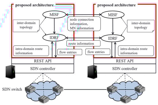 All the SDN controllers in a network have an inter-domain topology information. The inter-domain topology information consists of network address of each domain in network, IP address of each domain’s SDN controller, and inter-domain link information. MISF and IDRF use this information to search domains and calculate routes.