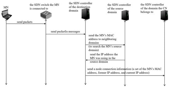 - Figure 7 shows a sequence diagram of MISF. When an MN makes an inter-domain move, the SDN controller of the destination domain detects the connection of the MN within the destination domain (attachment of the MN). The SDN controller detects the attachment of the MN with the packets sent from the MN which the SDN controller of the destination domain does not have information of the MN such as MAC address and IP address. Then, the SDN controller of the destination domain searches for the MN’s source domain by asking from the destination domain’s neighboring domains whether a node with the MN’s MAC address belonged to them. If there was, the SDN controller of the source domain replies the IP address the MN was using in the source domain. After discovering the source domain, the SDN controller of the destination domain informs a node connection information, that is a set of the MN’s MAC address, the IP address the MN was using in source domain (former IP address), the IP address the MN is using in destination domain (current IP address) to the SDN controller of the domain the CN belongs to. The SDN controller obtains the information of the domain the CN belongs to from the packets sent from the MN to the CN.