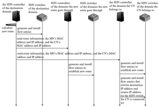 - Figure 8 shows a sequence diagram of IDRF. The SDN controller of the destination domain does all the calculation and the queuing. This function selects a new route using the routing mechanism we described above. Then, it informs the SDN controllers of the domains the new route goes through a bundle of information needed for establishing the new route; the MN’s MAC address, current IP address, former IP address, the CN’s MAC address and IP address. The SDN controllers that received them generate and install appropriate flow entries into SDN switches. In addition, in the domain which the CN belongs to, this function generates flow entries that rewrites destination IP addresses and source IP addresses of the packets sent between the MN and the CN and installs them in the SDN switch the CN is connected to. The rewriting of IP addresses is based on the node connection information that it received in the MISF. SDN switches do this rewriting processes. This allows the MN and the CN to continue their communication by keeping TCP connection.